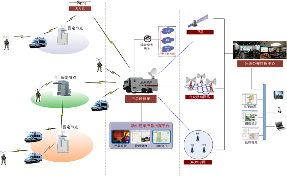 JC-Mesh与卫星通信系统、4G公网及340M警用城域专网,通过桥接和系统融合,实现现场覆盖与大跨距传输的“远近衔接”,自组网通信节点与340M警用城域网固定基站的“动静结合”,以及与4G公网的“公专融合”,构建基于卫星通信网的宽带无线应急通信系统
